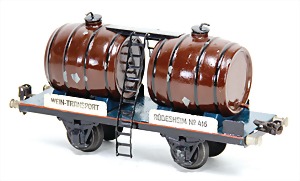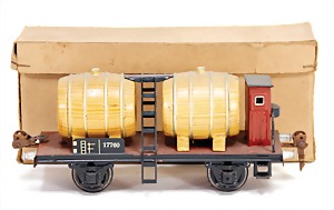 Spur 0, Plattformwagen mit Tank, 1984, Uhrwerk intakt, Orig.-Gummiketten verzogen, sehr schöner Orig.-Zust., Dachbodenfund