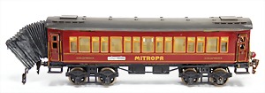 Spur 1, Mitropa Speisewagen, 1842, rot, mit Inneneinrichtung und Figuren, 42 cm, Federpuffer, Krakelee-Bildung, bespielt