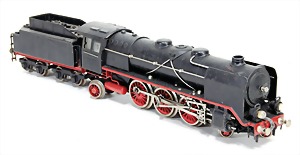 Spur 0, HR 6612920, 20 Volt, Schlepptenderlok 2C1, schwarz, Federpuffer, 2 elektr. beleuchtete Stirnlampen, Beschriftung abgegriffen, bespielter guter Orig.-Zust. mit etwas Lagerungsspuren, Dachbodenfund, techn. nicht geprüft