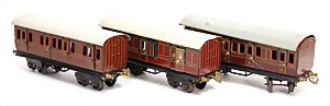 Spur 0, 3-tlg., 2x 4-achsiger Personenwagen, braun, 1. u. 3. Klasse, 24,5 cm, 1x Druckstelle am Dach, sonst bespielt gut, dazu passender Gepäckwagen, Lackfehler am Dach