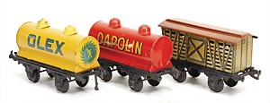 Spur 1, 3-tlg., Kesselwagen Olex, 2-achsig, Kesselwagen Dapolin, 2-achsig, 1 Viehwagen, 2-achsig, 19 cm, bespielt- gut