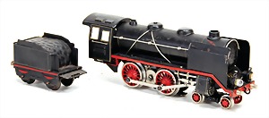 Schlepptenderlok B, elektrische Ausführung, schwarz mit roten Zierlinien, 3015, bespielt, techn. nicht geprüft, dazu ein Schlafwagen, Achse: 21,5 cm, bespielt
