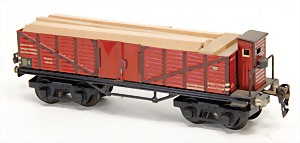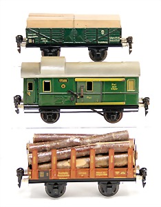 Spur 0, 3-tlg., 1761 Hochbordwagen, 1732 Gepäckwagen mit Schlusslicht, 1772 Rungenwagen mit Stammholz, guter Zust.