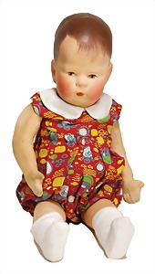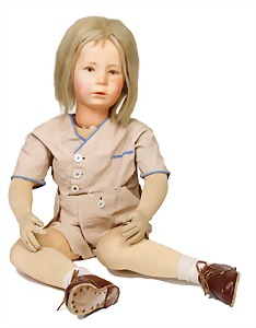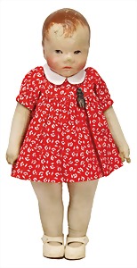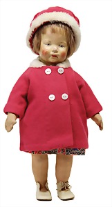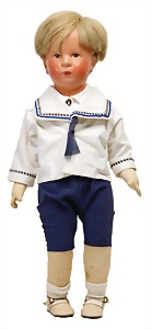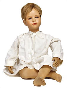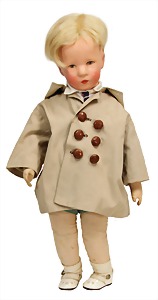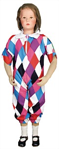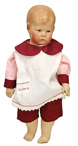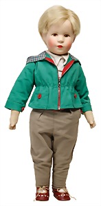 Friedebald, Deutsches Kind, unter der Perücke sichtbare Hinterkopfnaht, grüne gemalte Augen, leichte farbl. Ausbesserungsstelle an der Nasenspitze, Trikotkörper in gutem Zust., abgenähte Kniekehlen, 51 cm