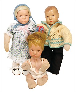 Puppe Nr. 1, 3 deutlich sichtbare Hinterkopfnähte, braune gemalte Augen, breite Hüfte, Stoffkörper in gutem Zust., minim. Flickstellen an den Fingerspitzen, farbl. Abriebstellen am Hinterkopf sowie Stirn, Nase u. Wangenpartie, farbl. Ausbesserungsstellen auf der Nase sowie teilw. auf den Wangen, 40 cm
