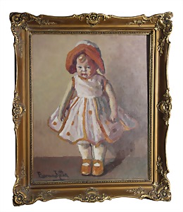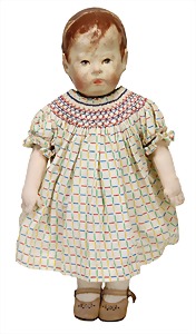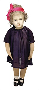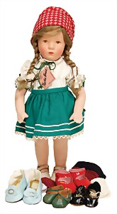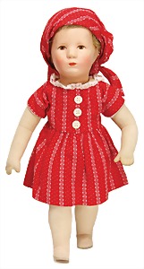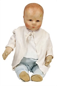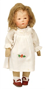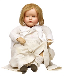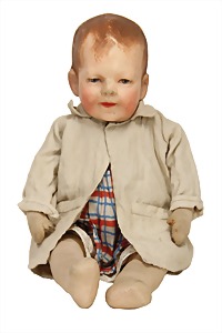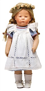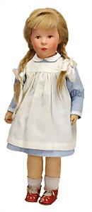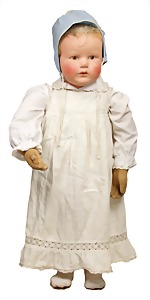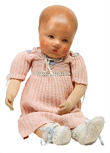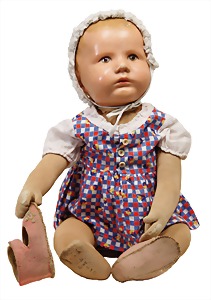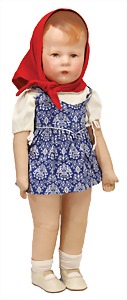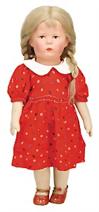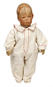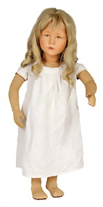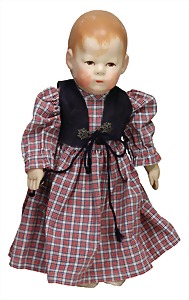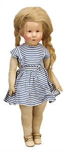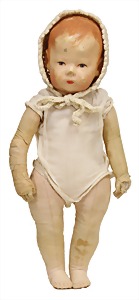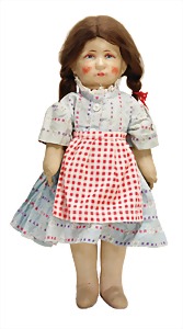 Puppe Nr. 1 H, Stoffkopf, 3 Hinterkopfnähte, separat angenähter Daumen, Perücke, Stoffkörper mit schmaler Hüfte, Kniekehlen aufgerissen, sowie 1 Bein getaped, Gesicht gut, Bemalung etwas dunkel unter UV-Licht, für uns jedoch Orig., bitte besichtigen