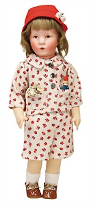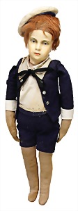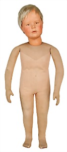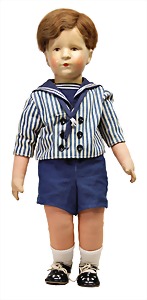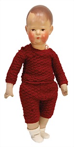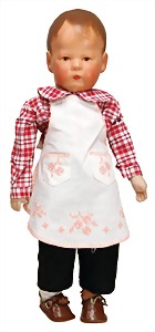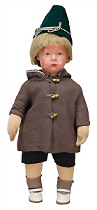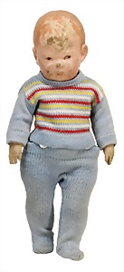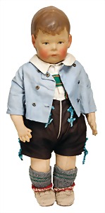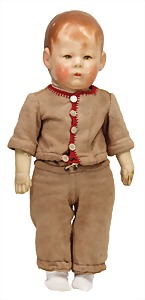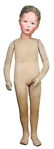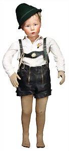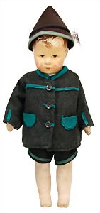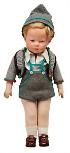 früher Junge, Drehkopf, braune gemalte Haare, Hinterkopf farbl. ausgebessert, braune gemalte Augen, leicht schattierte Augenlider, sowie leicht errötete Wangen u. Ohren, breite Hüfte, stämmiger Trikotkörper, 40 cm