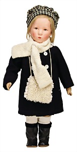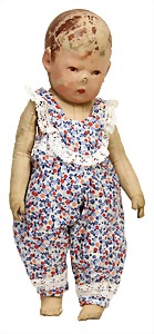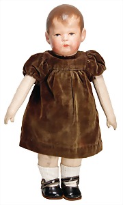 Puppe, Nr. 1, Stoffkopf, 41 cm, 3 deutlich sichtbare Hinterkopfnähte, blaue gemalte Augen, leichte Abriebstelle an Wange, Nasenspitze, Stirn u. Hinterkopf, Arme getaped, sowie 1 off. Stelle an der linken Hand, separat angenähter Daumen, breite Hüfte, Füße in gutem Zust.
