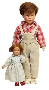 Friedebald, Junge, 50 cm, Kunststoff-Kopf, mit Perücke, braune gemalte Augen, leichte Abriebstelle auf der Nasenspitze, sowie an einer Wange, 1 Hand etwas berieben, Körper leicht verschmutzt, sonst gut, dazu 1 Däumelinchen, 70er Jahre, 26 cm