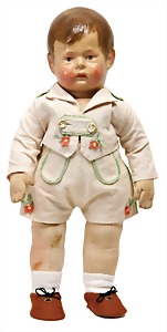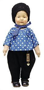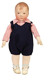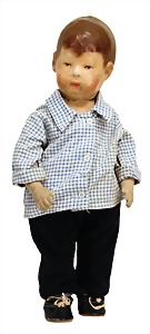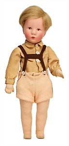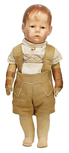 Stoffpuppe, Junge, drehbarer Kopf, deutlich sichtbare Hinterkopfnaht, braune gemalte Haare sowie Augen, Abriebstelle an Nase u. an Stirn, breite Hüfte, Trikotkörper in gutem Zust., minim. Abriebstelle an der Hand, 33 cm