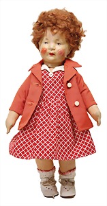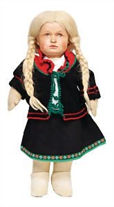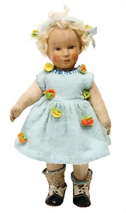 kl. Stoffpuppe, drehbarer Kopf, gemalte braune Augen, blonde lockige Perücke, Filzkleidung, rechte Hand mit Flickstelle, Trikotkörper sonst in gutem Zust., 25 cm