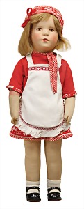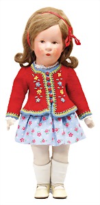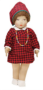 Ilsebill, deutsches Kind, Stoffkopf, erst unter der Perücke deutlich sichtbare Hinterkopfnaht, braune gemalte Augen, Trikotkörper in gutem Zust., abgenähte Kniekehlen, 44 cm