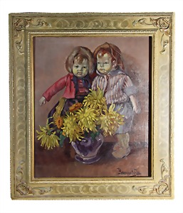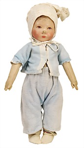 kl. Du Mein, 36 cm, Stoffkopf, 3 Hinterkopfnähte, dünne Bemalung, breite Hüfte, separat angenähte Daumen, kl. Abriebstelle auf der Nasenspitze, Nasenspitze etwas ausgebessert, off. Stellen an den Fersen, sonst guter- sehr guter Zust.