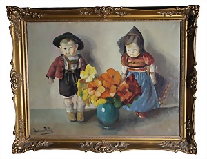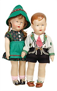 Pärchen, Junge u. Mädchen, in Trachtenkleidung, H: 40 cm, Junge, farbl. Ausbesserungsstellen am Hinterkopf, blaue gemalte Augen sowie gemalte Haare