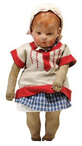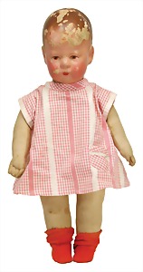 Stoffpuppe, Drehkopf, deutlich sichtbare Hinterkopfnaht, grüne gemalte Augen, Abriebstelle an Wange u. Nase, leichte Farbausbesserung auf Nasenspitze sowie Stirn, 33 cm, Trikotkörper in gutem Zust.