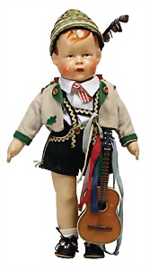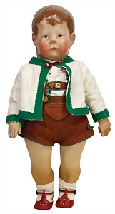 Junge, Papiermaché-Kopf, mit Ölfarbe bemalt, Nessel-Stoffkörper, 40 cm, Filz-Trachtenkleidung, wohl Orig.