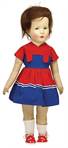 Puppe, 1 H, 3 deutlich sichtbare Hinterkopfnähte, Stoffkopf, aufgesetzte Perücke, gemalte Augen, minim. farbl. Ausbesserungsstellen im Gesicht, Trikotkörper, mit schmaler Hüfte, abgenähte Kniekehlen, 44 cm