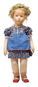 Mädchen, 50 cm, Stoffkopf, unter der Perücke deutlich sichtbare Hinterkopfnaht, grüne gemalte Augen, leichte Abriebstellen auf Wangen, sowie Nasenspitze, Trikotkörper, lange schlanke Beine, aufgesetzte blonde Orig.-Perücke