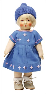 Stoffkopf-Puppe, deutlich sichtbare Hinterkopfnaht, blaue gemalte Augen, Mohairperücke, Stoffkörper, bewegl. Arme u. Beine, beriebene Hände, 34 cm
