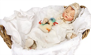Träumerchen, 45 cm, Stoffkopf, dünne Bemalung, beschwert, minim. Abrieb auf der Nasenspitze, ein paar Flecken am Körper, sonst nahezu unbespielt, mit Korb, alte Kleidung, Steckkissen, sehr ausdrucksstark