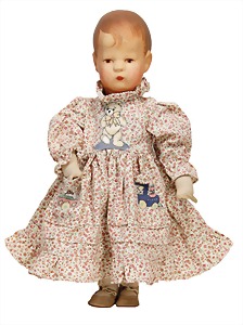 Puppe, Nr.1, 39 cm, 3 deutlich sichtbare Hinterkopfnähte, braune gemalte Augen, starke Abriebstellen im Gesicht, sowie Stirn und Hinterkopf, breite Hüfte, Orig.-Kleidung, separat angenähter Daumen, Arme mit Tape-Stellen, sowie 1 Stelle verschlissen, Füße in gutem Zust.