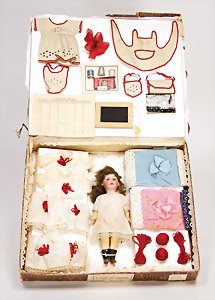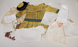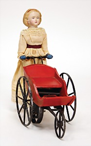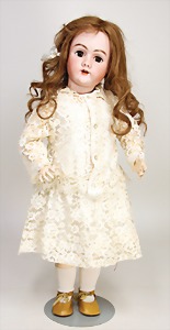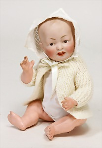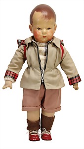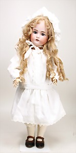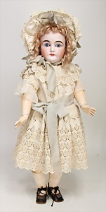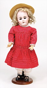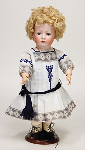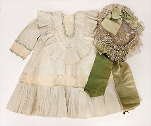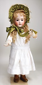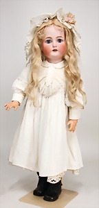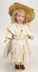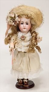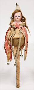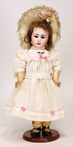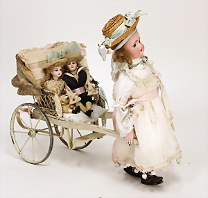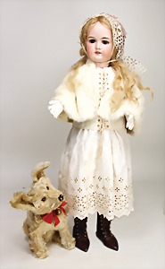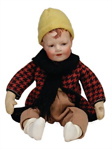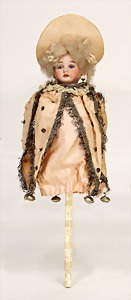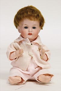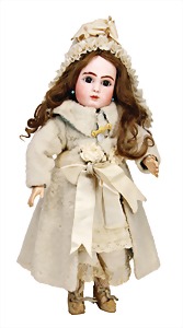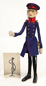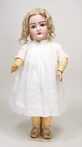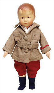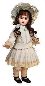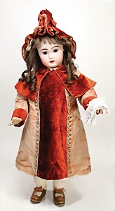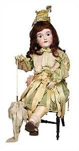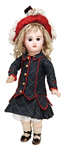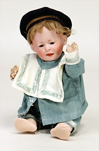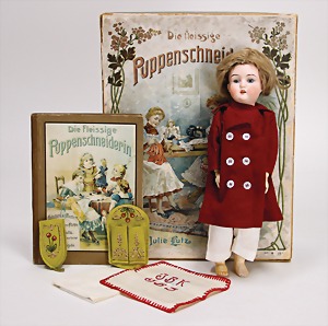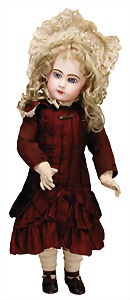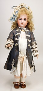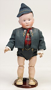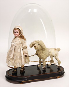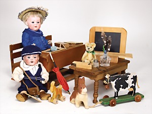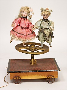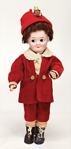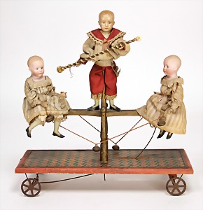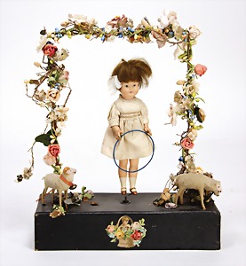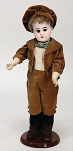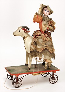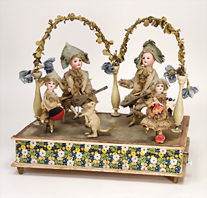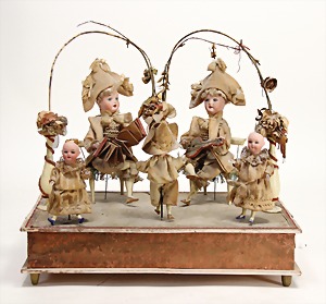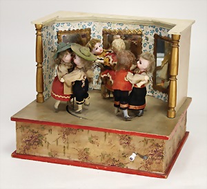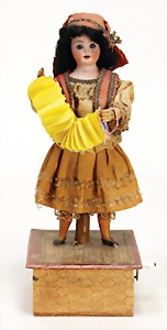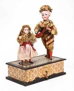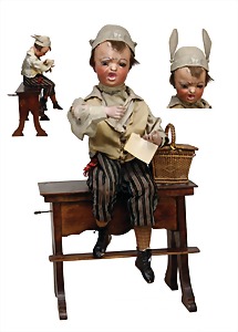 Automat, Frankreich, dieser Automat ist abgebildet im Buch Christian Bailly, L`age d`Or des Automates, 1848 - 1914, Seite 164, Schuljunge mit Eselsmütze, 51 cm, Masse-Kopf, braune fest eingesetzte Glasaugen, off./geschl. Mund, schreiend, Drahtkörper, Porzellan-Arme, auf Schulbank sitzend, Puppe bewegt den Kopf sowie den Arm, Orig.-Kleidung, schöner Orig.-Zust., museal, Uhrwerk u. Musikspielwerk intakt, Seide altersbed. etwas verschlissen