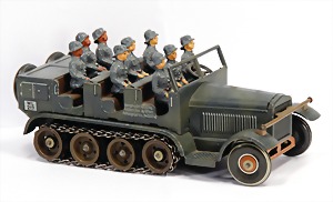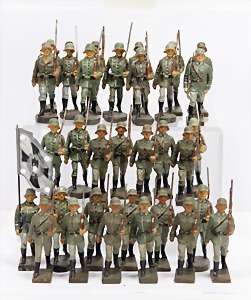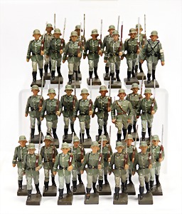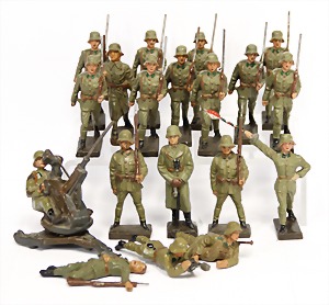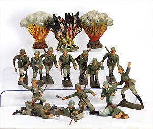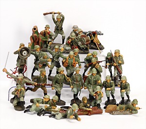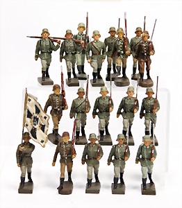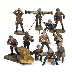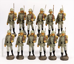 2. Weltkrieg, 7,5 cm, 12 Teile, marschierend, mit aufgesetztem Tornister, davon 1 Figur Tornister fehlt, teils ein paar Spannungsrisse, Zust. 2-3