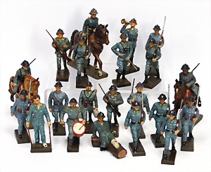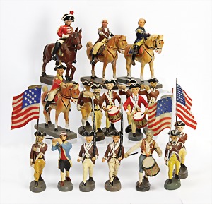 7,5 cm, Masse, amerikanischer Unabhängigkeitskrieg, 5 Reiter, Musiker, Fahnenträger, marschierende, 16 Teile, meist Zust. 2-3, teils kl. Stellen ausgebessert