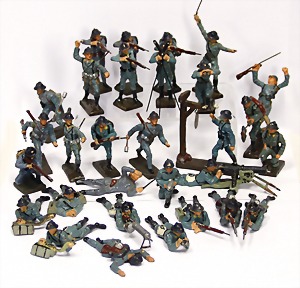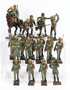 Konv., kämpfend u. marschierend, Masse, passend zu 7,5 cm, 20 Figuren, 1 Reiter, meist Zust.