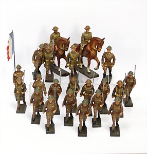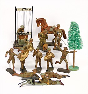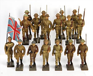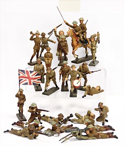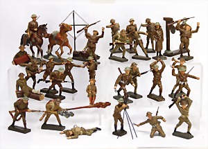 2. Weltkrieg, Masse, 7,5 cm, Engländer, 4 Figuren kämpfend, 1 Maschinengewehrschütze, Mann mit Telefon, Mann am Funkgerät, 3 Musiker marschierend, 1 Hauptmann, 1 Pferd, Mann am Boden liegend, meist Zust. 2