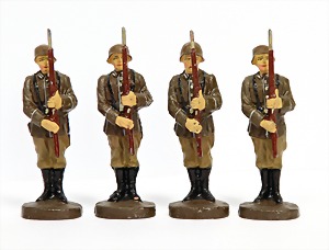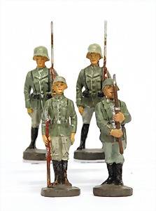 7,5 cm, 2. Weltkrieg, 4 Figuren stillgestanden, 1 x Gewehr mit Bajonett, am Boden stehend, Gewehr vorne tragend, Gewehr über der Schulter, Zust. 2 -