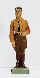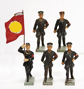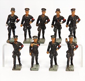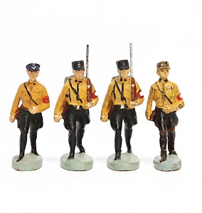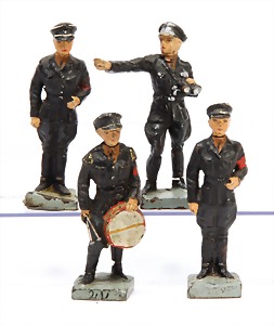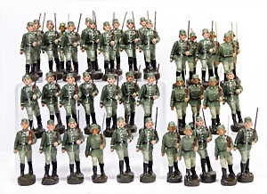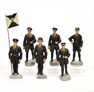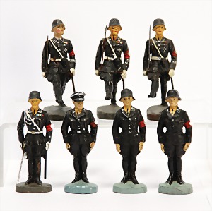 Masse, 7,5 cm, SS, 3 Teile marschierend, 1x stillgestanden, Fuß 1 Seite weggebrochen, 1 Fahnenträger stillgestanden mit Blech-Fahne, 1 Figur ungem., Zust. 2-
