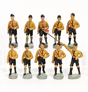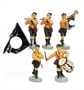 passend zu 7 - 7,5 cm, 2. Weltkrieg, Pimpfe, 5 Musiker, Trommler, Fanfarenbläser, Fahnenträger mit Blech-Fahne, Zust. 2