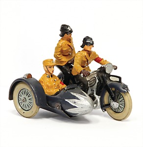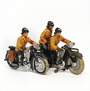 2 Motorradfahrer, Masse, passend zu 7 - 7,5 cm, 2. Weltkrieg, 1x mit Sozius u. Stützrädern, Blechräder, 1x Masse-Räder, Ständer u. Sozius fehlen, sonst Zust. 2-