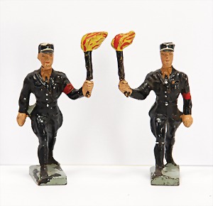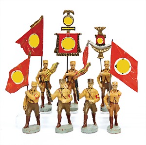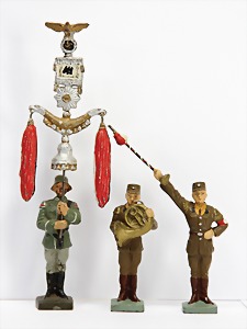 Masse, 7,5 cm, 2. Weltkrieg, 2 Standartenträger, 1x Blech-Standarte, 1x Masse, 2 Fackelträger, 1 Figur Masse-Fahne, 1 Figuren Blech-Fahne, marschierend, Zust. 2-3