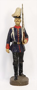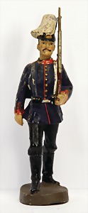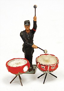 Stillgestanden, Masse, 7,5 cm, 1 Musiker, Zust. 2, 1 Schellenbaumträger (gr. Schellenbaum), Lackfehler im Gesicht