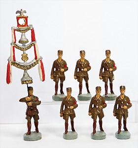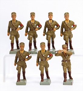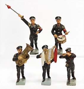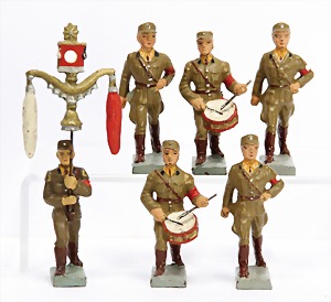 Masse, 2. Weltkrieg, 7,5 cm, Reichsarbeitsdienst, 6 Teile, marschierend, 1 Schellenbaumträger, meist Zust. 2. 1 Figur Bruchstelle am Hals
