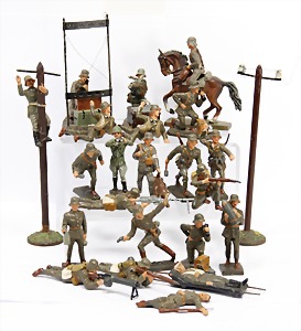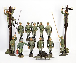 Konv. LINEOL, 2. Weltkrieg, Masse, passend zu 7,5 cm, Figuren mit Kabelrolle, Telegraphenmasten, Zust. 2-3, 16 Teile