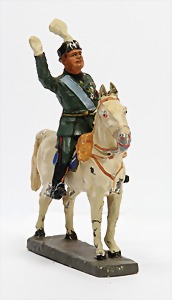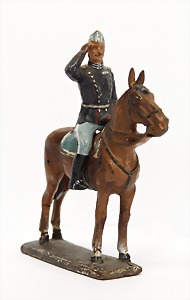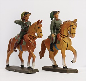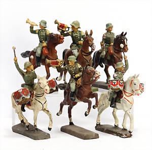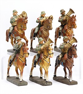 passend zu 7,5 cm, Masse, 2. Weltkrieg, 6 Reiter, davon 2 Paukenschläger, 1 Figur am Sockel beschädigt, sonst Zust. 2-3