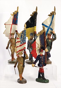 2. Weltkrieg, 7,5 cm, 4 Figuren marschierend, davon 1 Hand weggebrochen, dazu 1 Fahnenträger, Zust. 2-3