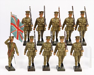 10 Teile Engländer, Masse, 7,5 cm, 2. Weltkrieg, marschierend, 1 Fahnenträger, kl. Abriebstelle an der Fahne, Zust. 1-2