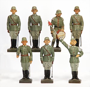 7-tlg, RAD, 7,5 cm, Masse, 2. Weltkrieg, 1 Flötenspieler, dazu 6 Figuren marschierend, Zust. 2