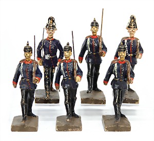 Masse, 1. Weltkrieg, 6 Teile, 11 cm, marschierend im Stechschritt, davon 2 Figuren im Paradehelm, Zust. 2-3