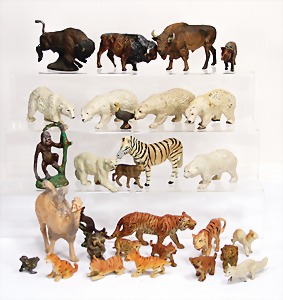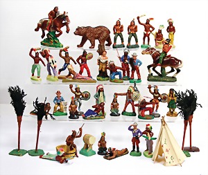 Masse, 7,5 cm, ungem., Indianer, 30 Teile, kämpfend, Lagerleben, mit Zubehör, meist Zust. 1-2, 1 Pferdekopf liegt lose bei