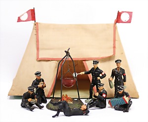 Masse, passend zu 7,5 cm, 2. Weltkrieg, SS, Lagerleben, 7 Teile, dazu 1 Lagerfeuer, meist Zust. 2, 1 Zelt