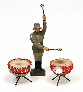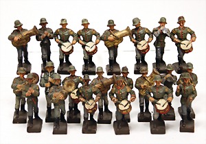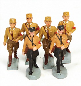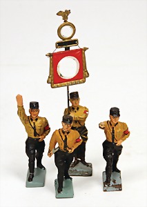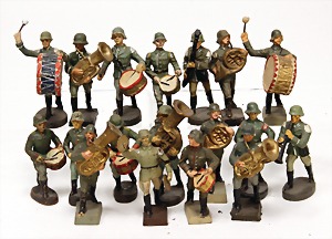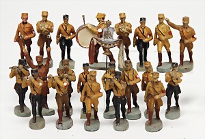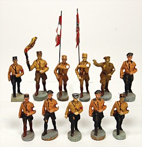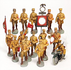 15-tlg., marschierend, Fahnenträger, Standartenträger, Fanfarenbläser, meist Zust. 2-3, dazu 1 Motorradfahrer, Masse, 7,5 cm, Zust. 2-3