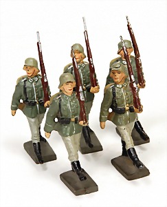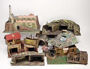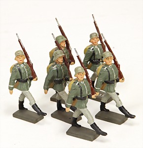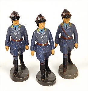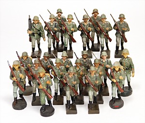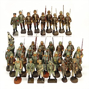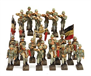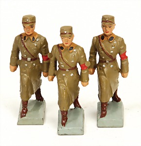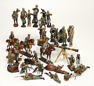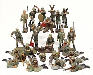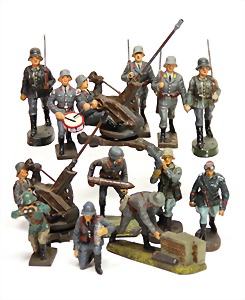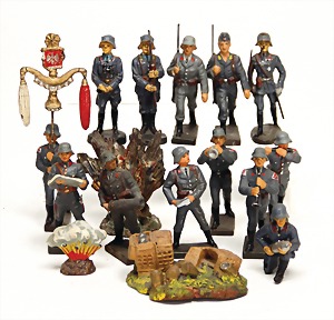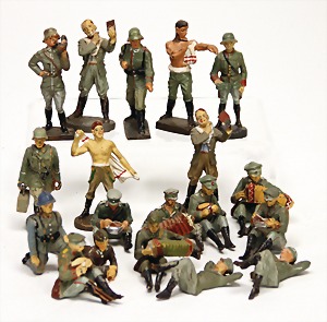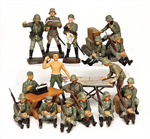 17-tlg., Mann mit Schreibmaschine, Kartentisch, Mann am Funkgerät ohne Antenne, sitzende Figuren, 7,5 cm, Masse, 2. Weltkrieg, meist Zust. 2-3
