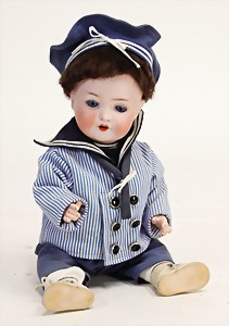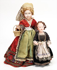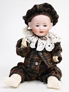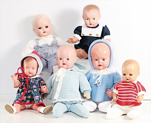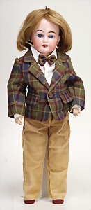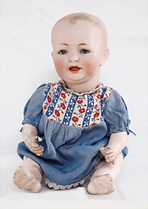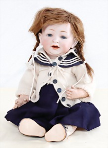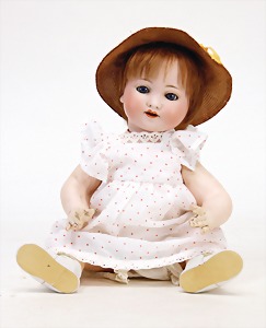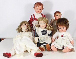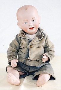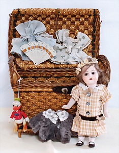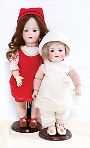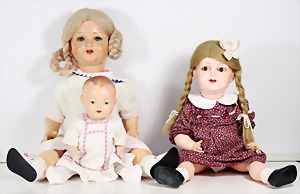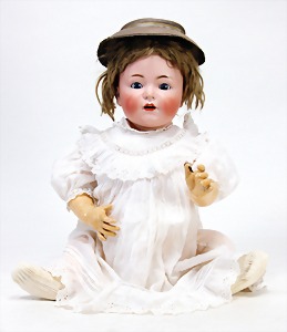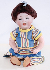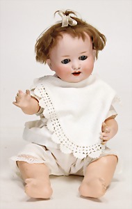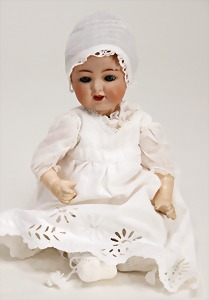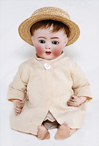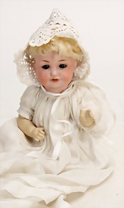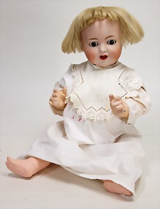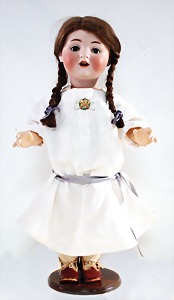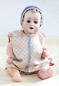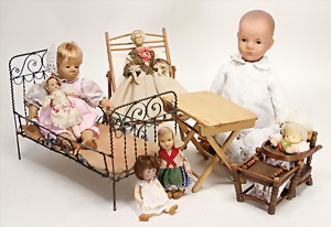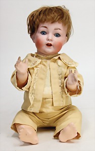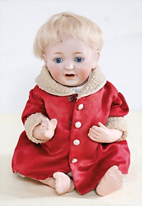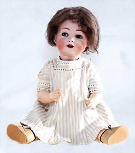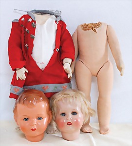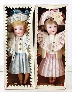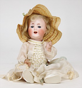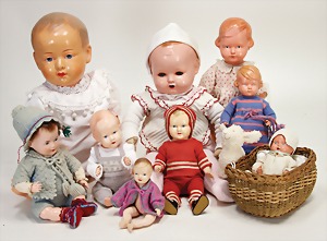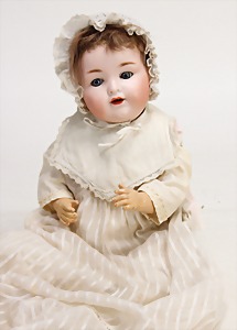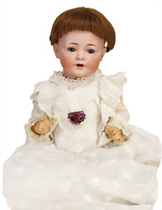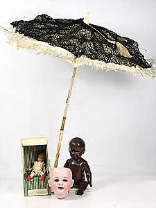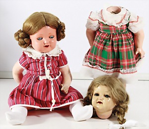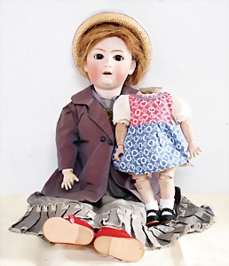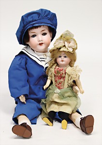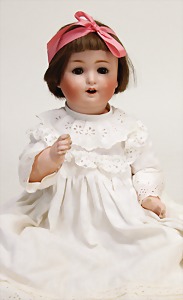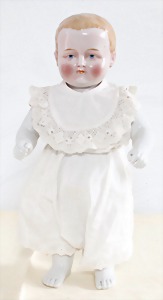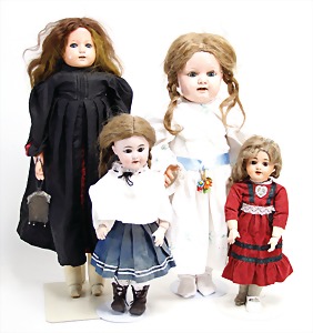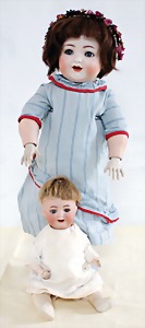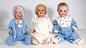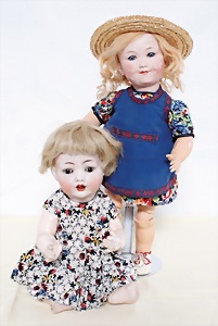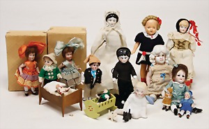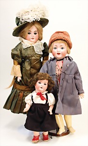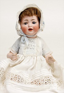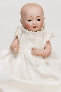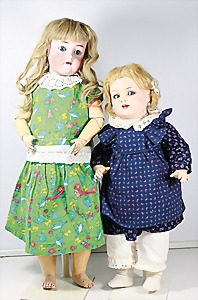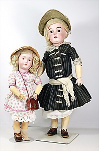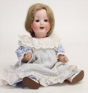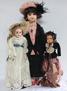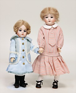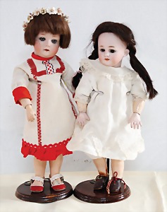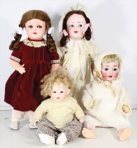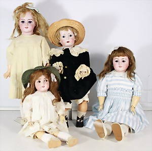 Biskuit-Porzellan-Puppen, 1x gem. DEP Nr. 9, blaue Schlafaugen, offener Mund, oben Zahnreihe, durchst. Ohren, Gliederkörper, Mohair-Perücke, 52 cm, dazu 1x Biskuit-Porzellan-Brustblattkopf, gem. DEP Germany Nr. 9, Simon & Halbig, braune Schlafaugen, offener Mund, oben Zahnreihe, durchst. Ohren, gegliederte Arme, Lederkörper, gegliederte Beine, 55 cm, dazu Biskuit-Porzellan Kurbelkopf, K&R, gem. 402, braune Schelmenaugen, offener Mund, oben Zahnreihe, durchst. Ohren, 43 cm, Gliederkörper 1x übermalt, dazu 1x Reproduktion, König & Wernicke, Nr. 1070, Biskuit-Porzellan-Kurbelkopf, blaue Glasaugen, offener Mund, oben 2 Zähne, Gliederkörper, 50 cm, alte Kleidung