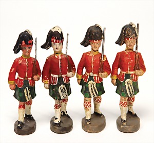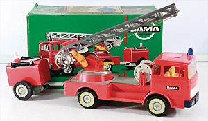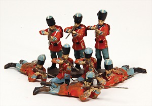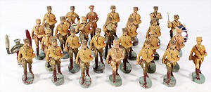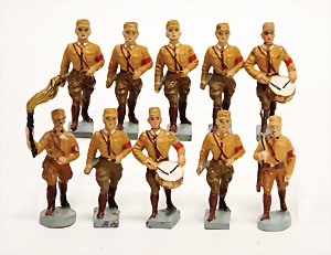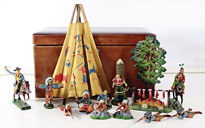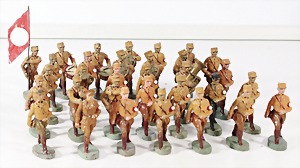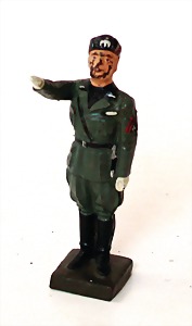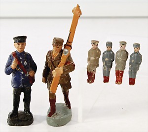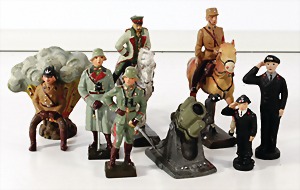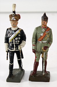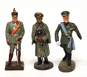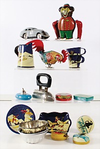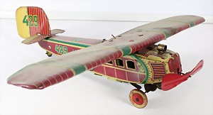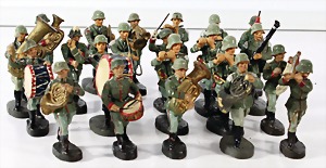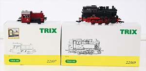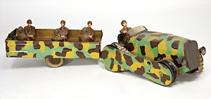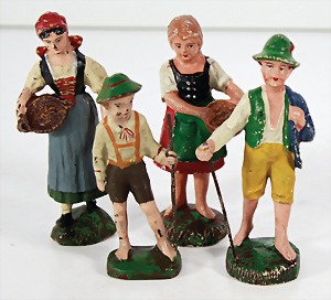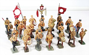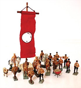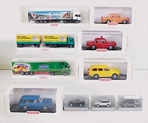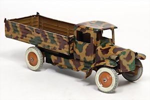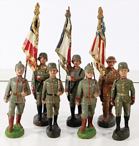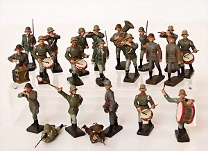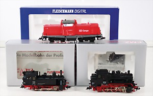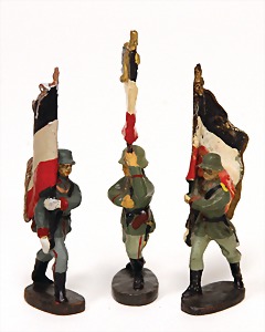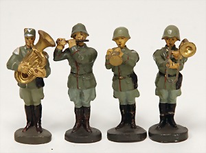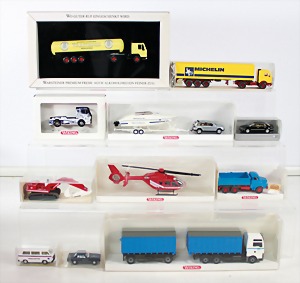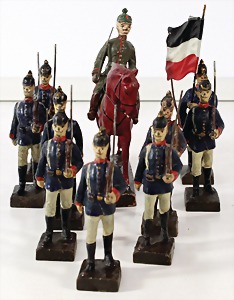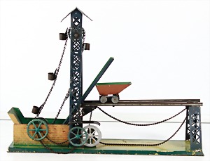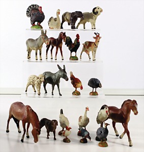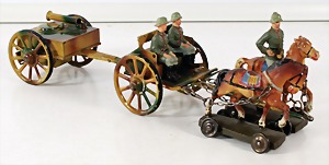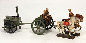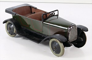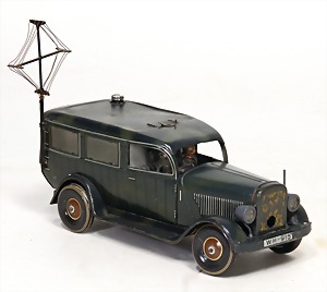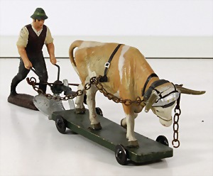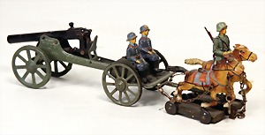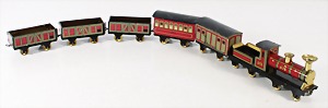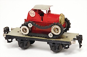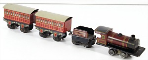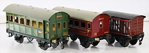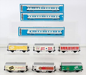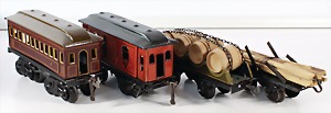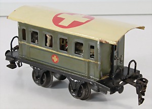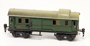 Konv. 3-tlg. Spur 0, Mitropa-Speisewagen, 2-achsig, Personenwagen, 1731, 2-achsig, grün, guter Zust., 1 Ziehwagen, altes Märklin-Zeichen, Blech handlackiert, 9,5 cm, teilw. farbl. ausgebessert (alte Übermalung), dazu 3 kl. Schweine, Ladegut, Masse