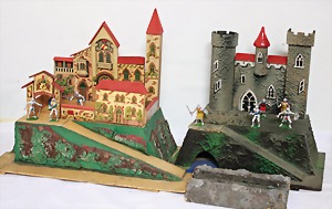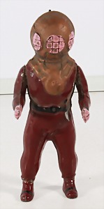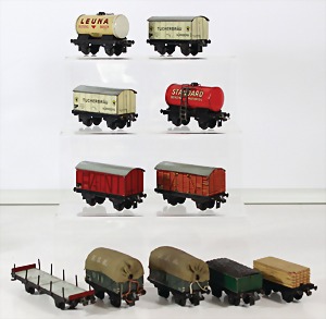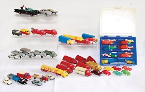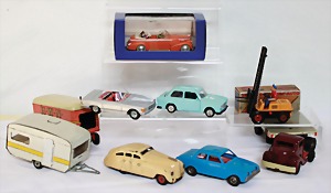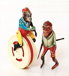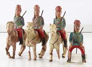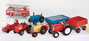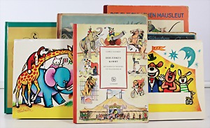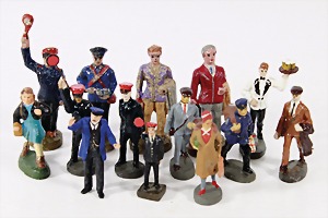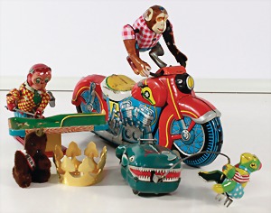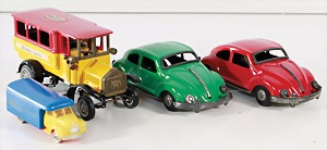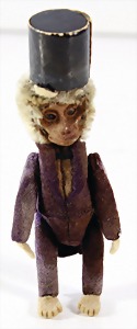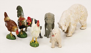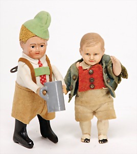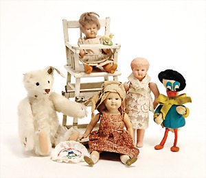 Konv. 3 Celluloid-Puppen, 1x gem. Germany, H: 16 cm, braune gemalte Augen, bewegl. Arme und Beine, modell. Schuhe und Strümpfe, 1x Celluloid-Puppe, bespielt, SoR, Nackenmarkierung 15, 1 Hochstuhl, H: 20 cm, Holz, mit Celluloid-Puppe, bewegl. Arme und Beine, ausmodell. Schuhe und Strümpfe, Nase weggebrochen, 1 Biege-Figur, Ente, Lenci?, 12 cm, 1 Steiff Replica-Bär, weiß, 16 cm, mit Knopf und Fahne